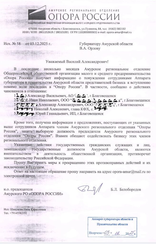 Скандал вокруг снятия главы Амурского отделения «Опоры России» продолжает развиваться. В офис и.о. председателя РО Бориса Белобородова на протяжении нескольких месяцев поступают сигналы от местных бизнесменов о попытках областных чиновников принудить их к вступлению в «Опору» с условием поддержки позиции губернатора Василия Орлова и президента организации Александра Калинина. Это происходит на фоне отказа президиума «Опоры России» признавать итоги состоявшихся в июле выборов председателя отделения, участники которых проголосовали за Белобородова.