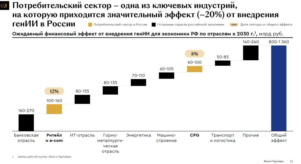 «По нашим оценкам, ожидаемый финансовый эффект от внедрения этих технологий для ритейла и e-com к 2030 году может составить 100–160 млрд руб., а для сегмента потребительских товаров — 60–100 млрд руб. Люди все больше устают от выбора и стремятся к простоте и эффективности. В этих условиях генеративный ИИ становится ключом к оптимизации клиентского пути — от рекомендаций и поддержки до автоматизации маркетинга и управления поставками», — отметила директор практики ИИ и высоких технологий «Яков и Партнёры» Марина Дорохова.