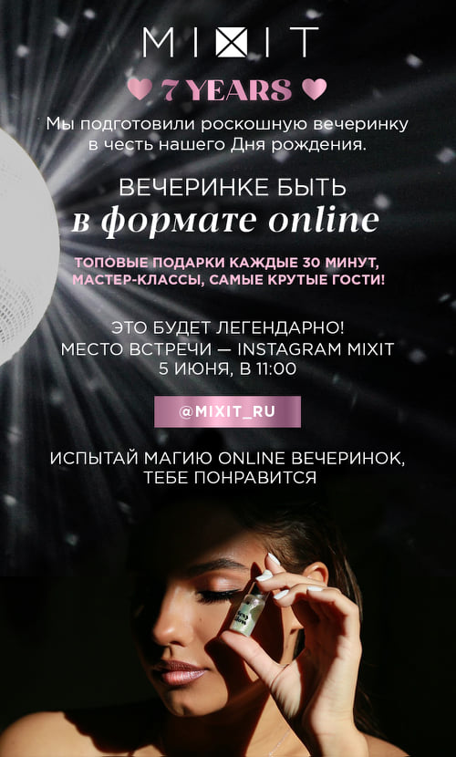 5 июня 2021 года в прямом эфире Instagram @mixit_ru пройдет роскошная on-line вечеринка. Каждые 30 минут розыгрыши призов от MIXIT и партнеров. Каждые 20 минут интерактивные мастер классы на любой вкус и интерес: beauty тренды в косметике и макияже, модные укладки и окрашивание волос, правильное питание и простые советы по приготовлению супер вкусных блюд, включаем спортивный режим вместе, учимся снимать тик-ток, гадаем на картах таро, слушаем концерт в прямом эфире!